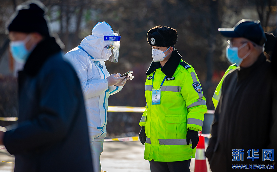 2月22日,在呼和浩特市玉泉区小召街道五塔寺广场临时核酸采样点,玉泉交管大队民警在执勤。新华网发(丁根厚 摄)