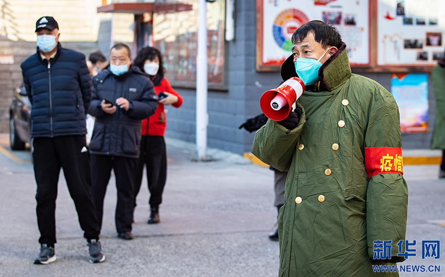 2月22日,在呼和浩特市玉泉区清泉街社区临时核酸采样点,志愿者在核酸采样现场维持秩序。新华网发(丁根厚 摄)