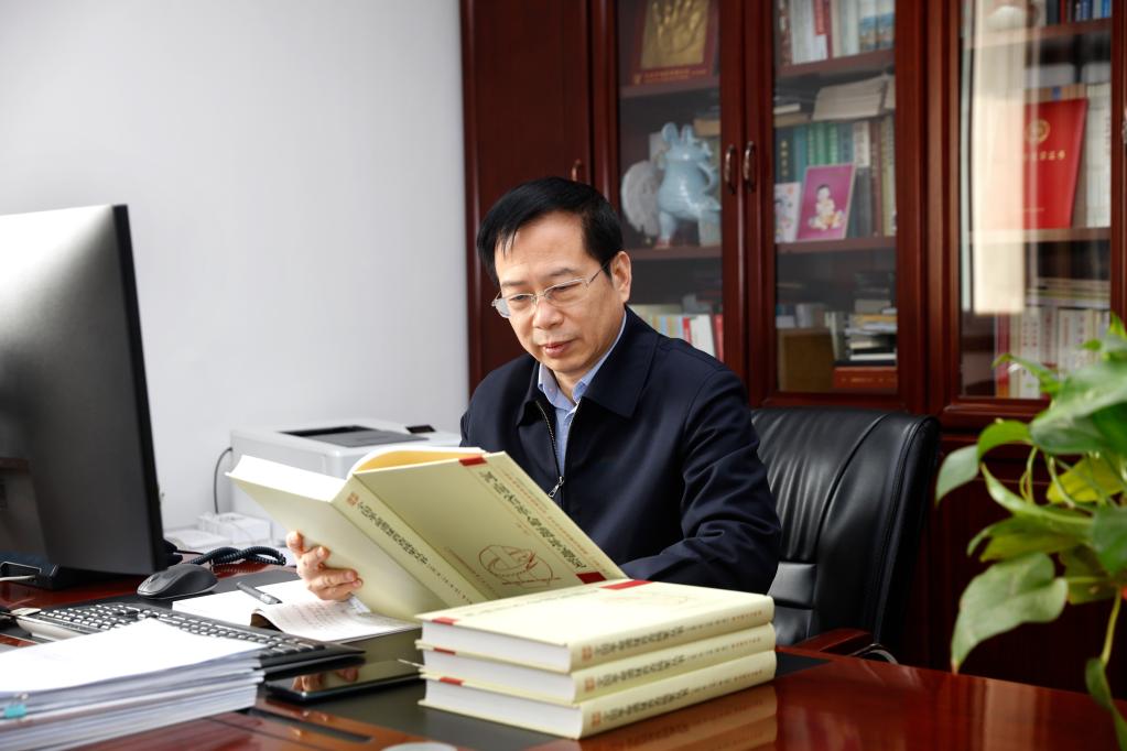 马萧林在查阅河南省革命文物相关资料。(河南博物院供图)