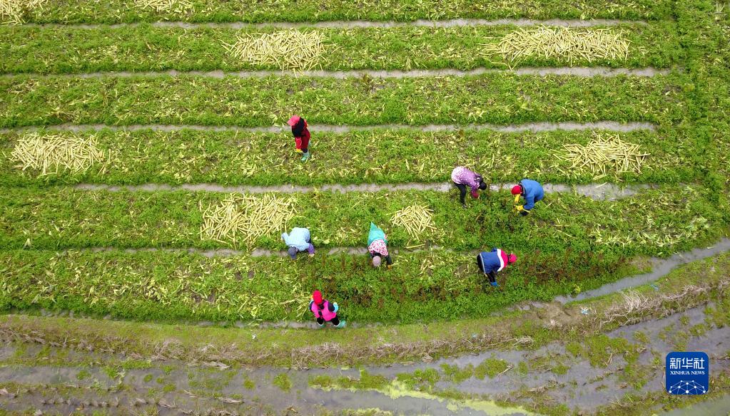 2月23日,广西贺州市八步区莲塘镇白花村农民在采摘收获蔬菜(无人机照片)。