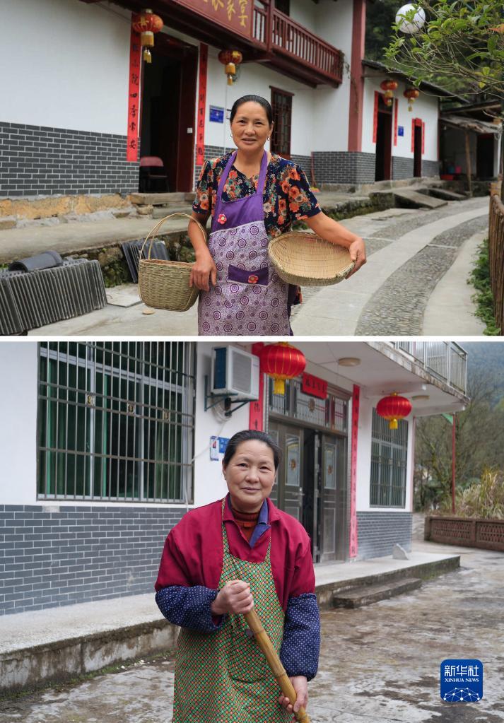 拼版照片:上图为江西省井冈山市神山村村民彭夏英站在自家开办的农家乐前(2016年9月10日摄,新华社记者万象摄);下图为彭夏英站在自家开办的民宿前(2022年2月15日摄,新华社记者郭杰文摄)。新华社发