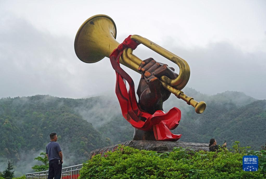 游客在江西省井冈山市参观“胜利的号角”雕塑(2021年4月27日摄)。新华社记者 万象 摄