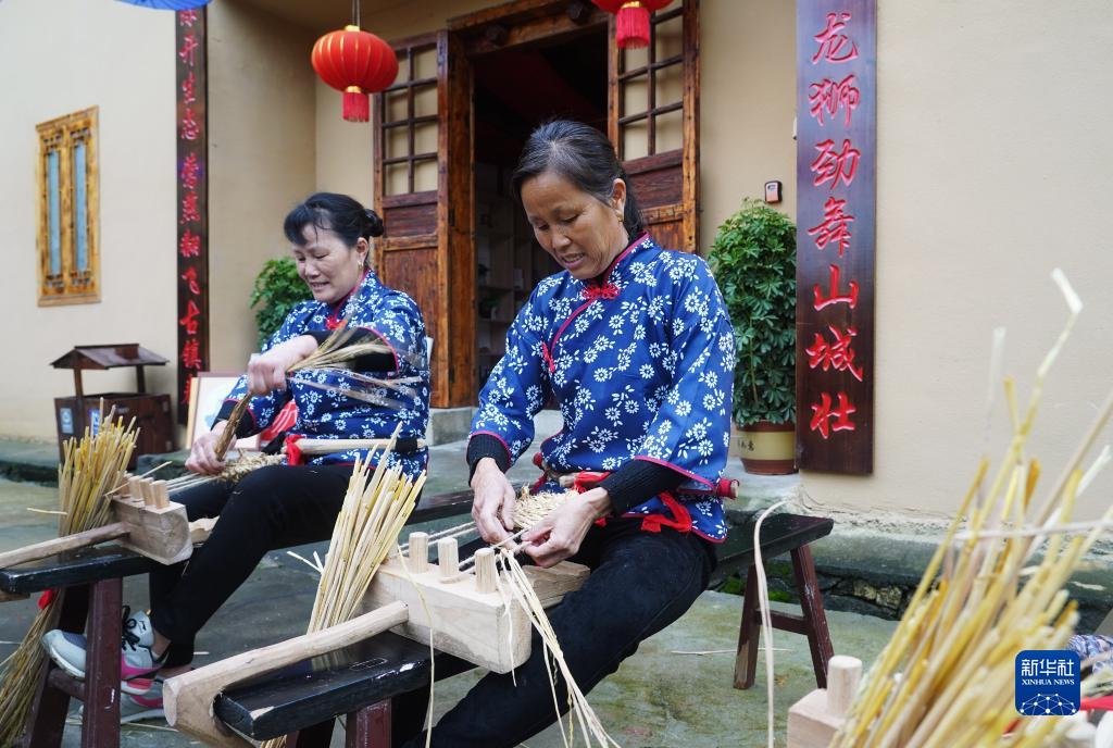 在江西省井冈山市古田村,村民在编草鞋纪念品(2021年4月28日摄)。新华社记者 万象 摄