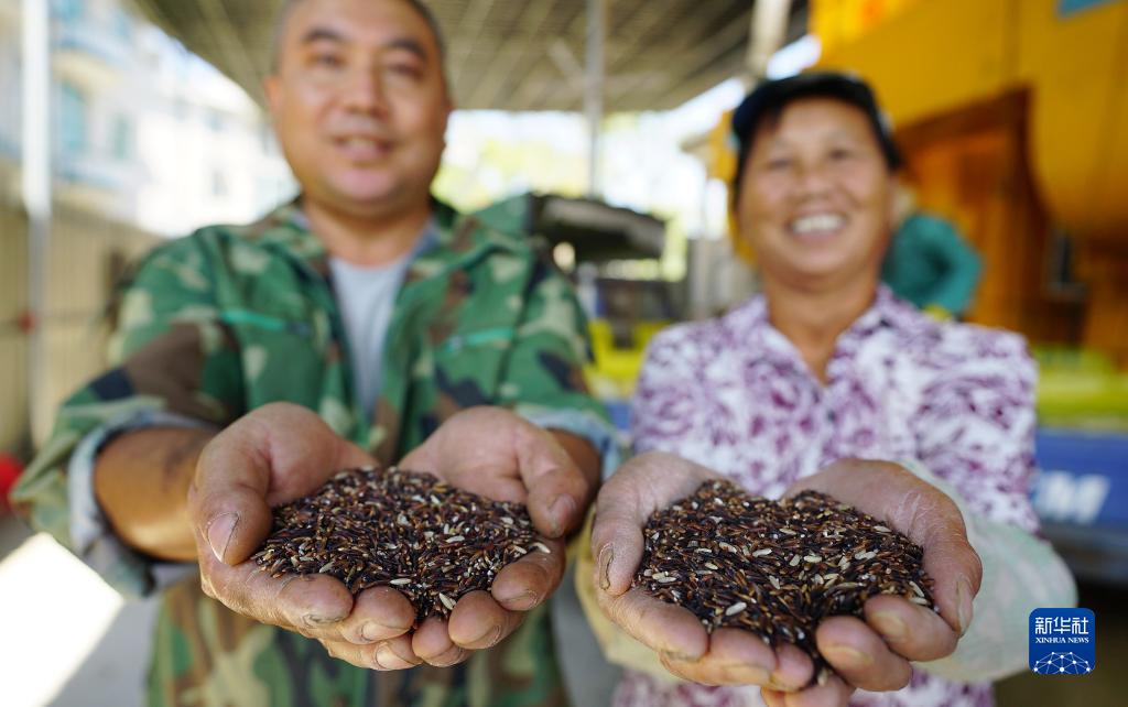 在位于江西省井冈山市龙市镇的井冈山市高山红米种植专业合作社,文龙才(左)和社员展示脱壳的井冈红米(2019年9月23日摄)。新华社记者 彭昭之 摄