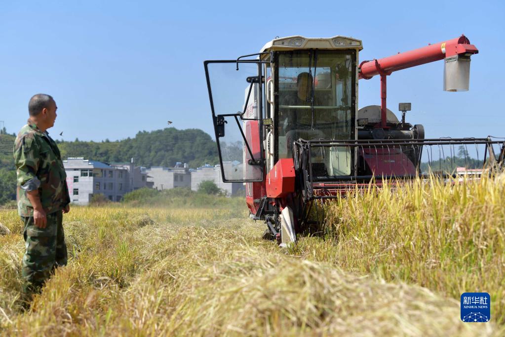 在江西省井冈山市龙市镇,井冈山市高山红米种植专业合作社社长文龙才(左)和社员在稻田里收割成熟的红米稻谷(2019年9月23日摄)。新华社记者 彭昭之 摄