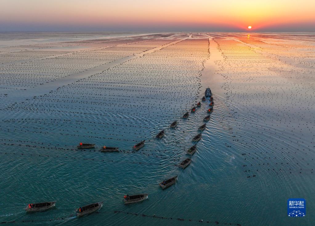 2月24日,在山东省荣成市俚岛镇俚岛湾海域,渔民们驾驶着渔船、舢舨迎着朝阳出海作业(无人机照片)。