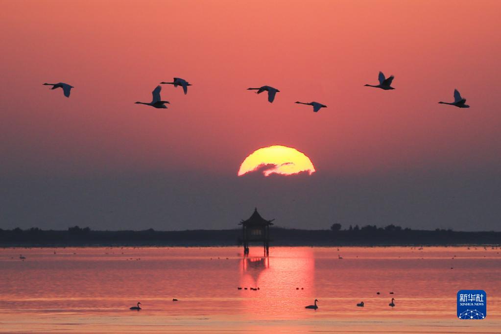 2月24日清晨,在山东荣成天鹅湖畔,一群大天鹅映着日出飞翔。