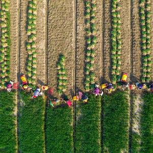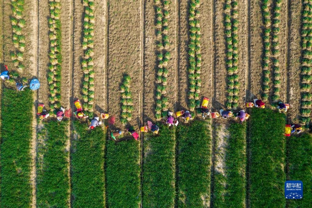 2月23日,江苏省兴化市垛田街道王横村农民在收获香葱(无人机照片)。