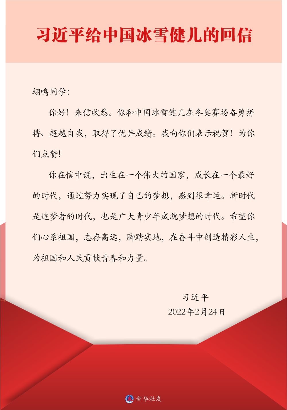 2月24日,中共中央总书记、国家主席、中央军委主席习近平给中国单板滑雪运动员苏翊鸣回信,向他和中国冰雪健儿取得优异成绩表示祝贺,并提出殷切期望。
