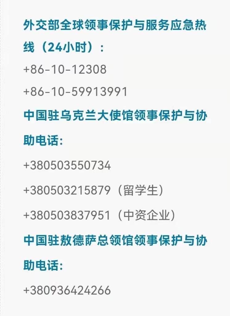 外交部和驻乌克兰使领馆将采取一切必要措施确保在乌中国公民安全。如遇紧急情况,请及时拨打外交部全球领事保护与服务应急热线,并与中国驻乌克兰使领馆联系。