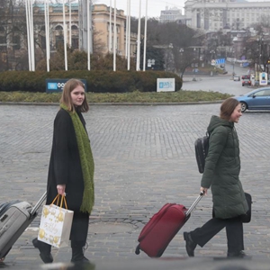 2月24日,两名女子拉着行李箱走过乌克兰基辅的欧洲广场。(新华社记者李东旭摄)