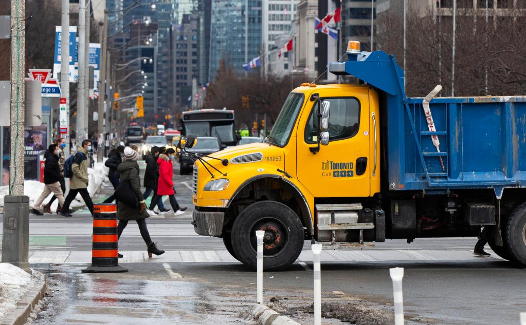 2月11日,在加拿大安大略省多伦多市,警方调动市政卡车封锁了安大略省议会大厦前的街道。加拿大首都渥太华所在的安大略省政府11日宣布,由于卡车司机抗议示威活动在该省蔓延,对经济造成重大影响,全省即日进入紧急状态。新华社发(邹峥摄)