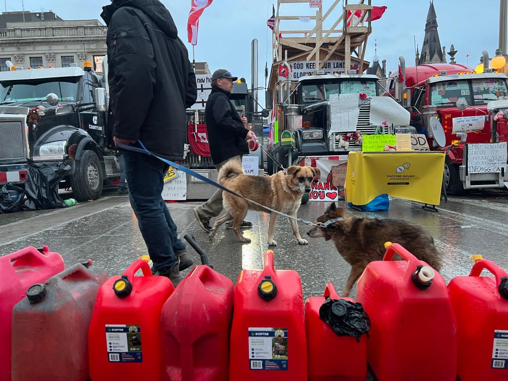 2月10日,在加拿大渥太华卡车司机抗议现场,遛狗的居民从卡车前走过。大量卡车司机连日来在渥太华进行示威活动,抗议一项新冠疫苗接种强制令。(新华社记者林威摄)
