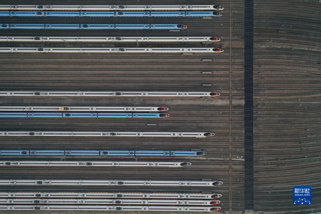 2月25日,动车组列车停靠在南京动车段南京南动车运用所存车线上(无人机照片)。 新华社发(方东旭 摄)