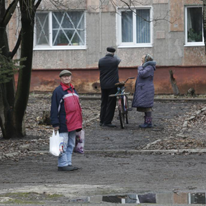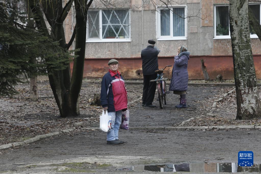 2月25日,顿涅茨克当地居民站在一栋建筑旁。新华社发(维克多摄)