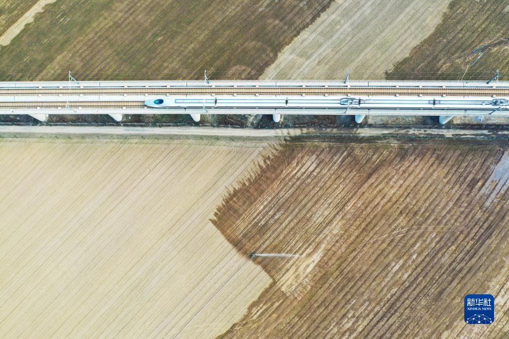 2月22日,高地隙植保机在山西省运城市芮城县新村作业(无人机照片)。新华社记者 柴婷 摄