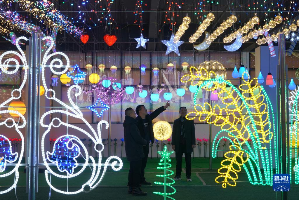 安康市白河县城关镇安坪社区一家灯饰社区工厂内展示的彩色灯饰(2月22日摄)。