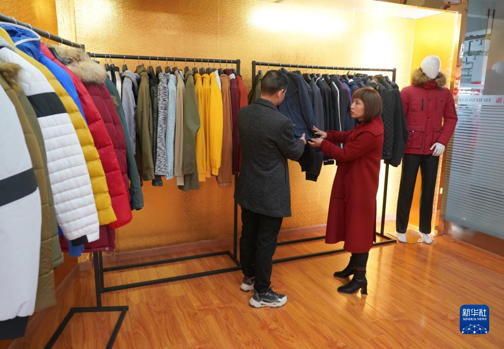 2月21日,在安康市白河县城关镇向荣社区一家服装社区工厂内,一名工厂负责人向客户介绍产品。