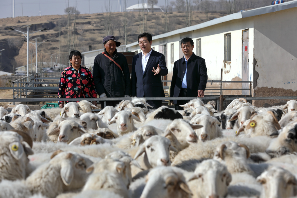 张宏祥(右二)在了解羊的养殖情况。新华社记者 原勋 摄