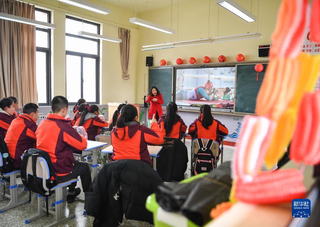 在成都市新都区特殊教育学校,教师赖桂红(后)为学生们讲解冬季两项中的射击项目(2月25日摄)。