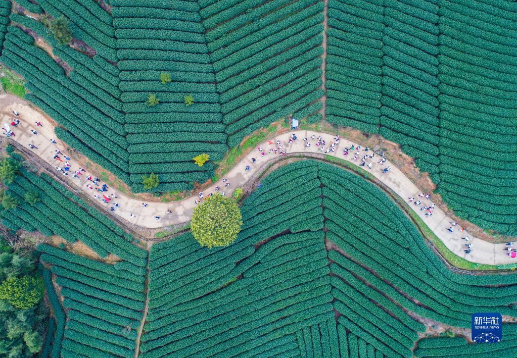 团队游客在杭州市富阳区拔山村万亩茶山游览(2018年3月26日摄,无人机照片)。浙江省“千村示范、万村整治”工程撬动了乡村从美丽生态到美丽经济,再到美好生活的良性循环。2018年,浙江“千万工程”获得联合国“地球卫士奖”中的“激励与行动奖”。新华社记者 徐昱 摄
