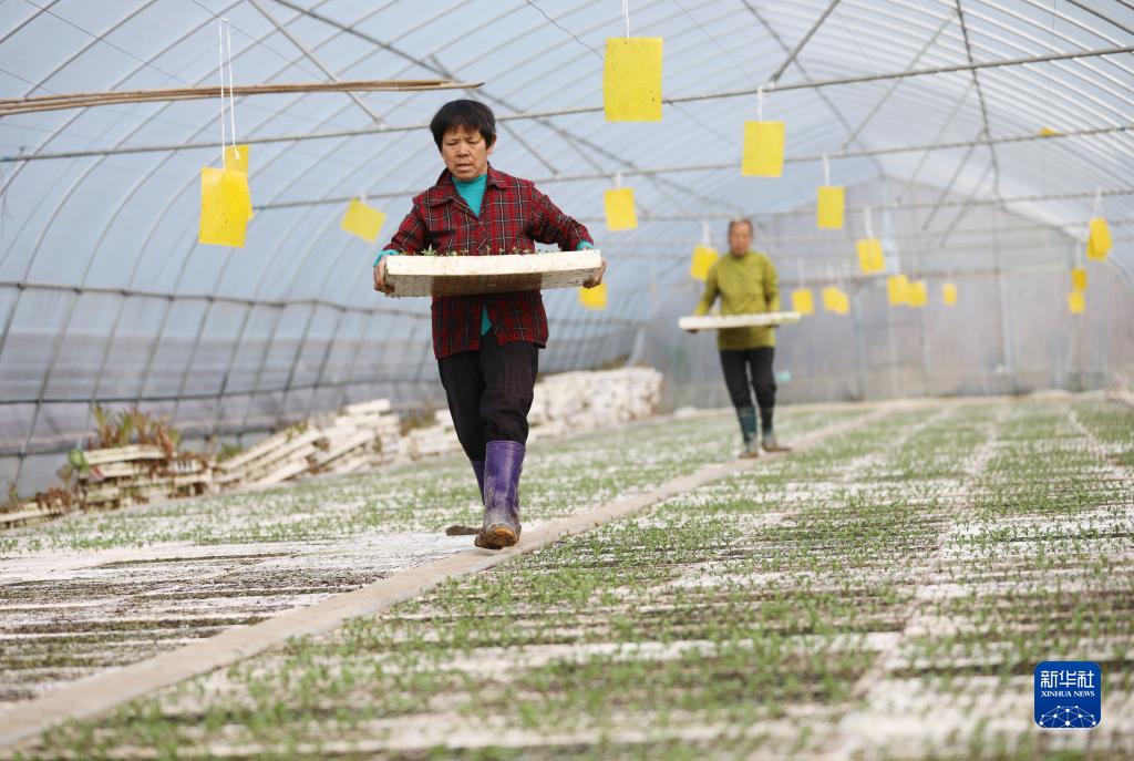 2月28日,在湖南省永州市道县东门街道高车村育苗大棚,菜农在大棚里劳作。