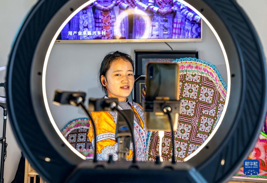 几千公里外,贵州毕节,“悬崖下的村寨”化屋村里,青春靓丽的“阿哥阿姐”借助电商直播,让特色苗绣源源不断飞出深山,走向全国。