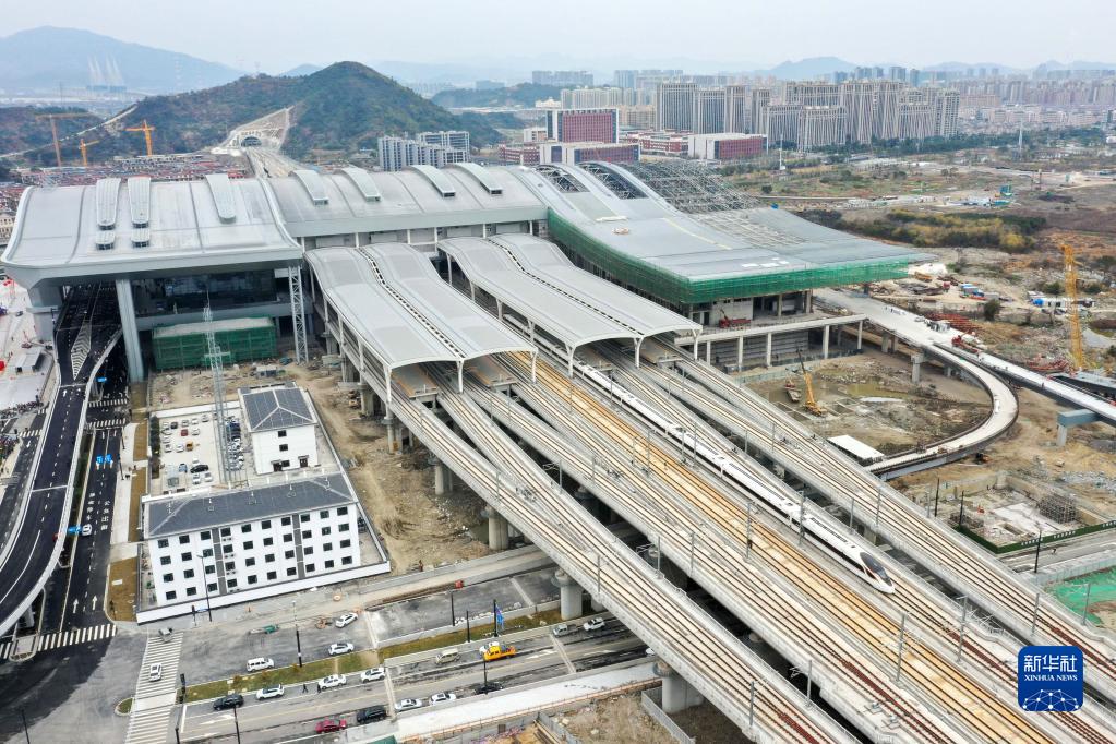 从浙江嵊州新昌站开出的杭台高铁首发列车停靠台州站后驶出,开往温岭方向(2022年1月8日摄,无人机照片)。新华社记者 黄宗治 摄