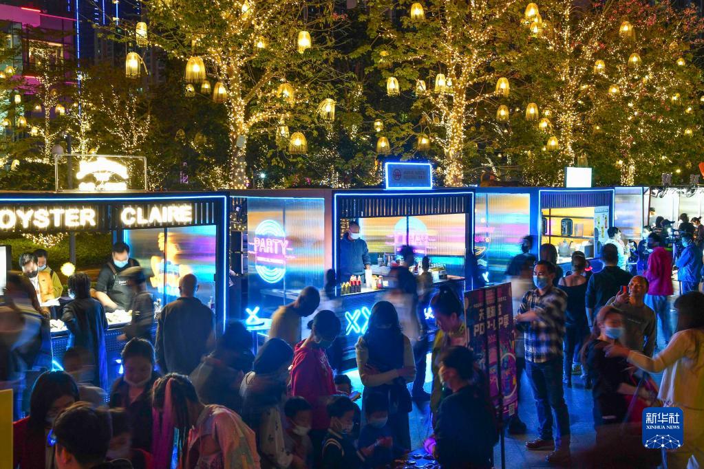 市民在广州夜经济集聚区天德广场天德快闪街品尝美食(2021年12月10日摄)。新华社记者 刘大伟 摄