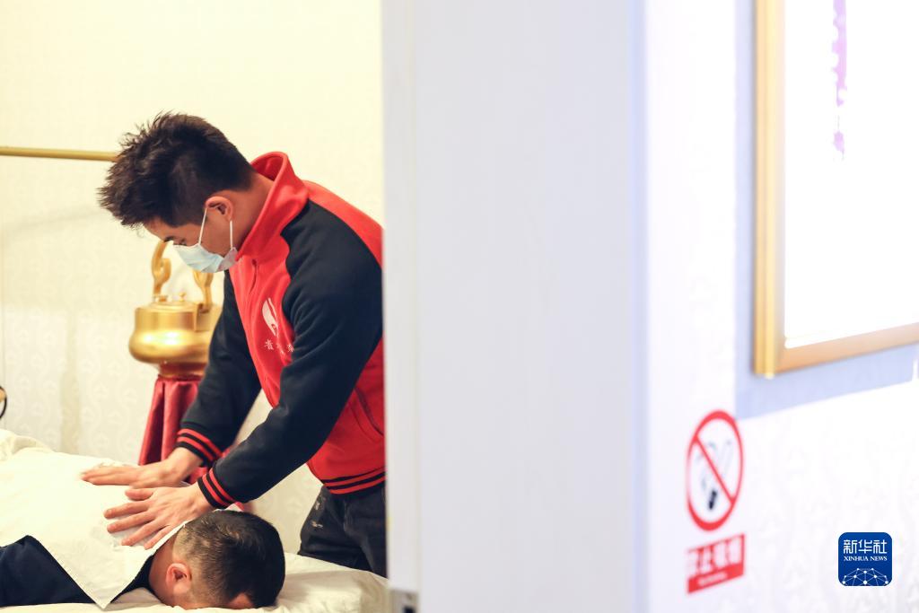 3月1日,“折耳根”乐队鼓手陈昌海在推拿店内给客人推拿。