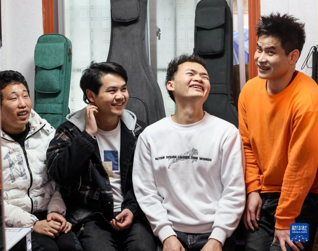 3月1日,“折耳根”乐队主唱陈克兴(左一)、吉他手杨志(右二)、鼓手陈昌海(右一)、贝斯手彭万海(左二)在推拿店内休息。