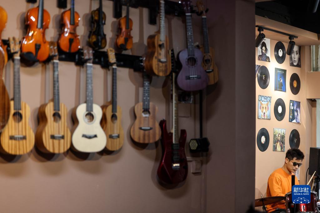 3月1日,“折耳根”乐队鼓手陈昌海在琴行内排练。