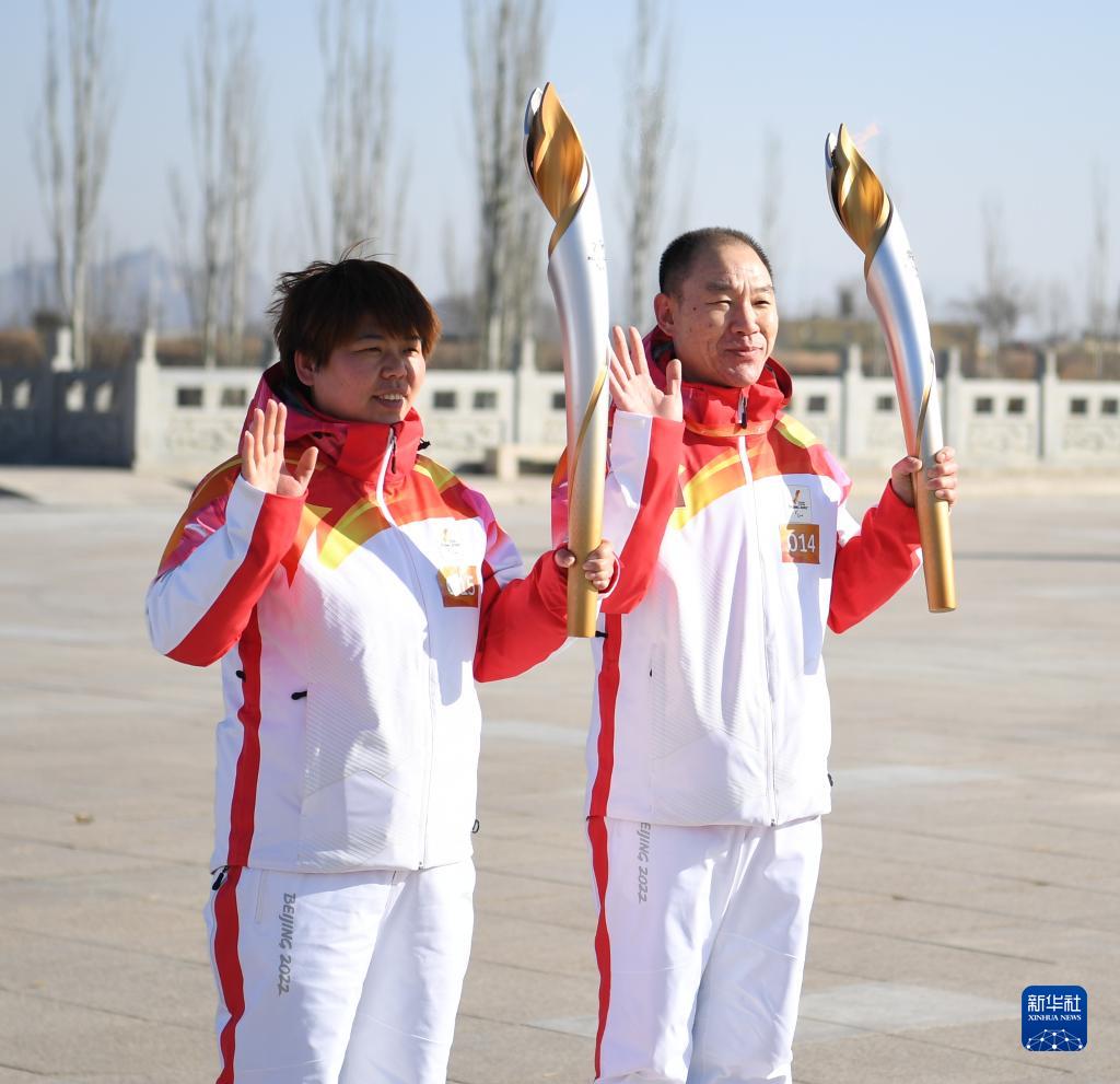 3月2日,火炬手米娜(左)和火炬手张文进行火种火炬传递。新华社记者 曹国厂 摄