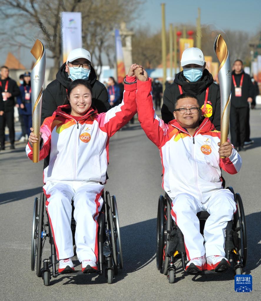 3月2日,火炬手张淼(左)、车驰在城市火种火炬传递中。新华社记者 李任滋 摄
