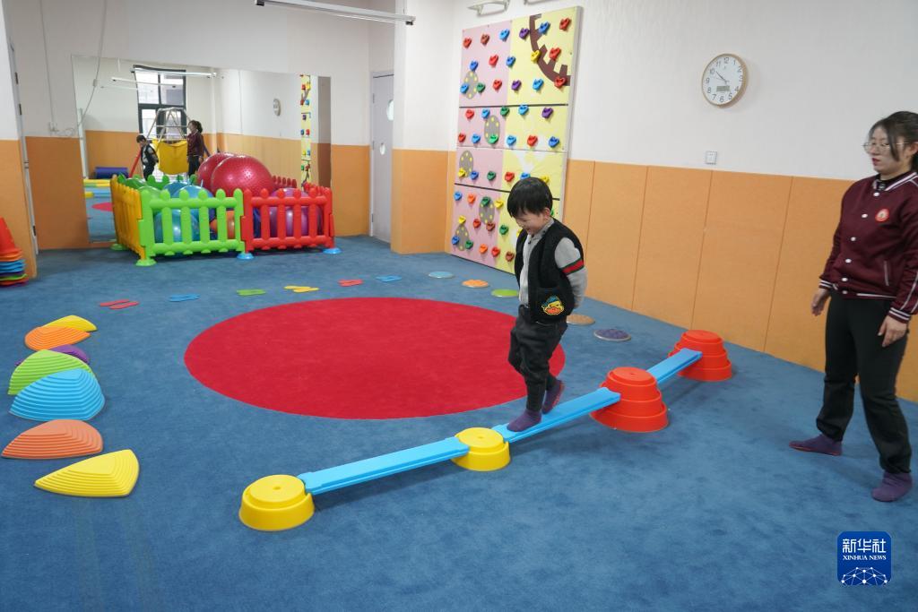 3月2日,在西安市莲湖区爱尔堡幼儿园体能活动室内,一名听障儿童在老师的帮助下进行感统失调训练课程。