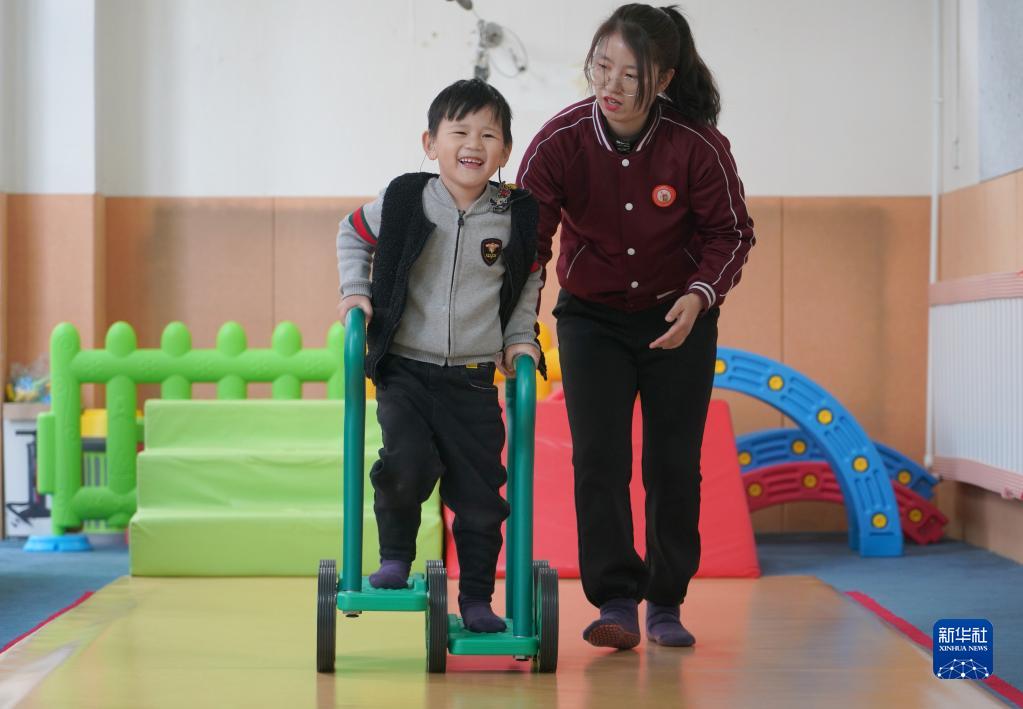 3月2日,在西安市莲湖区爱尔堡幼儿园,一名听障儿童在老师的帮助下进行感统失调训练课程。