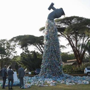 3月2日,在肯尼亚首都内罗毕,第五届联合国环境大会续会的参会代表观看一件艺术品,该艺术品展现了一个水龙头中流出的塑料瓶。新华社记者 龙雷 摄
