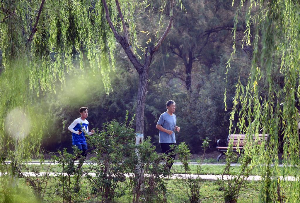 2021年7月1日,在天津市南翠屏公园,市民在公园步道上跑步健身。新华社记者 孙凡越 摄
