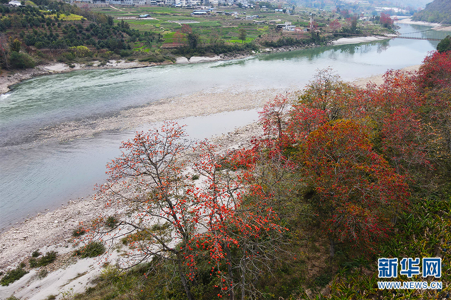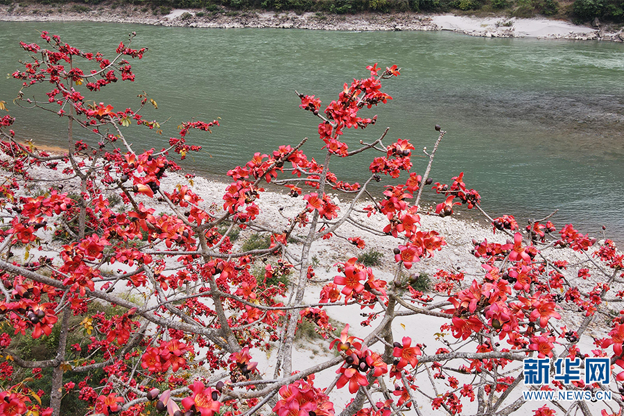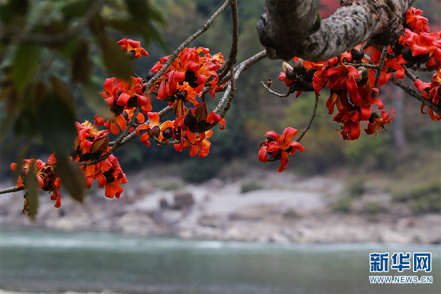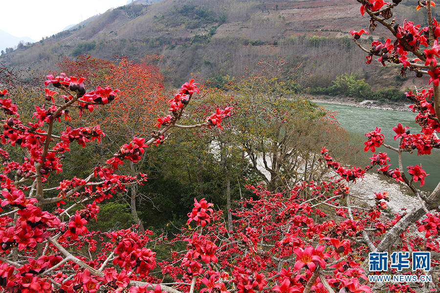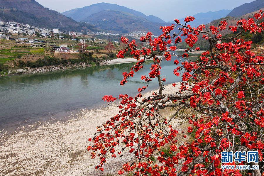 木棉花与江水相映成趣(2月21日摄)。 新华网发(施甸县融媒体中心供图)