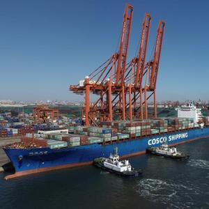 一艘轮船在拖轮的协助下向唐山港京唐港区集装箱码头靠泊(2021年10月23日摄,无人机照片)。新华社记者 朱旭东 摄