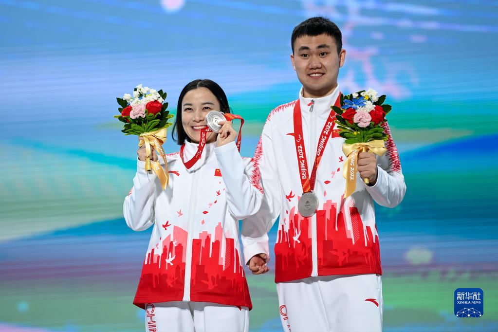 3月5日,获得银牌的中国选手朱大庆(左)和她的引导员闫寒寒在颁奖仪式上。