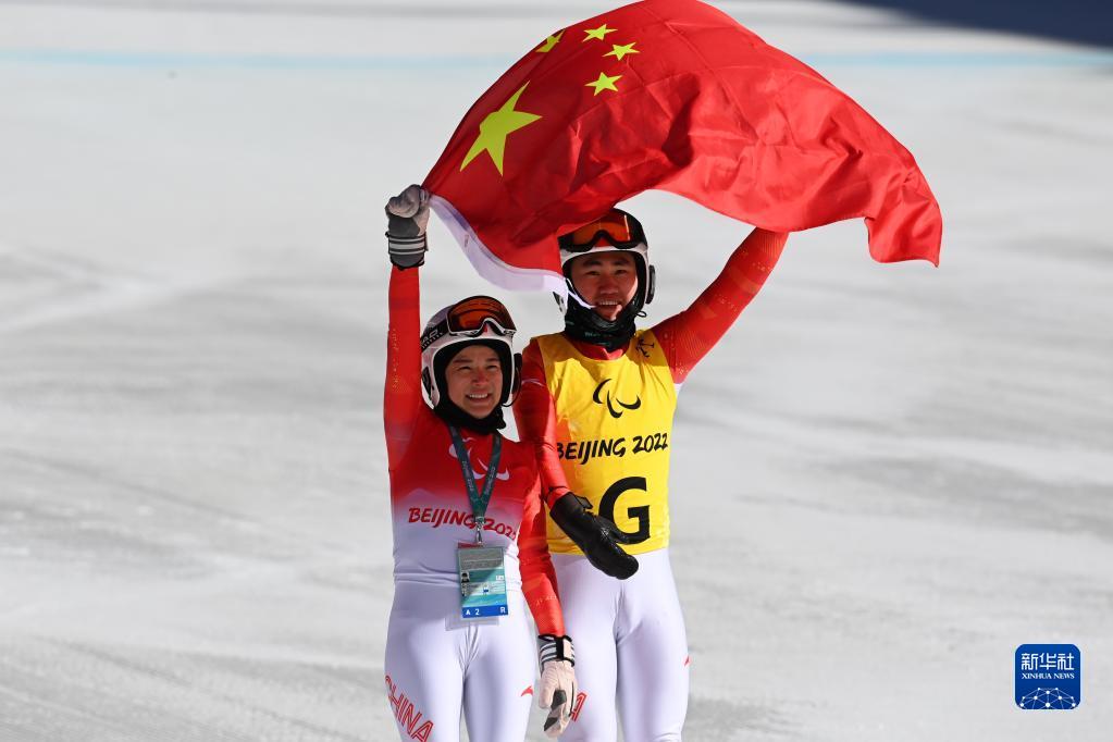 3月5日,中国选手朱大庆(左)和引导员闫寒寒赛后庆祝。