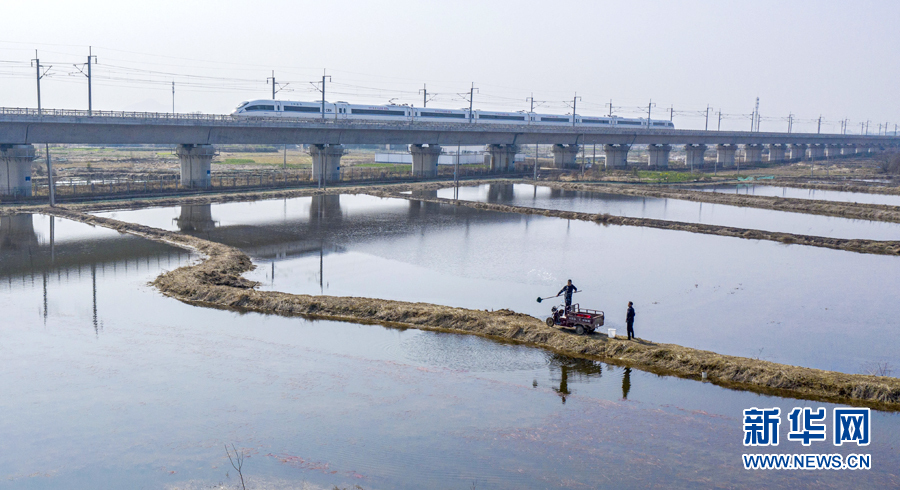3月3日,安徽省合肥市庐江县柯坦镇枣岗村,农民正在给虾苗投食,虾田“春耕”一片繁忙。