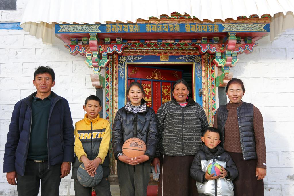 西藏自治区林芝市嘎拉村村民达瓦坚参(左一)一家在家门口合影(2022年2月23日摄)。 新华社记者姜帆 摄