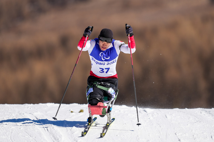 3月5日,刘子旭在北京2022年冬残奥会残奥冬季两项男子短距离(坐姿)比赛中。新华社记者胡超摄