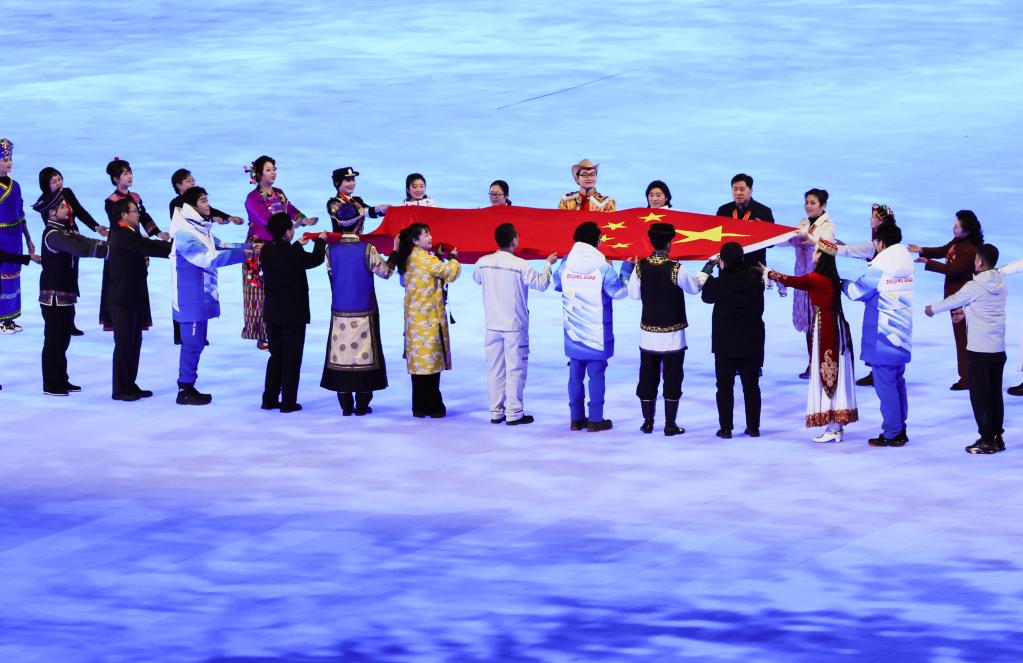 2月4日晚,第二十四届冬季奥林匹克运动会开幕式上,中华人民共和国国旗入场。新华社记者兰红光摄