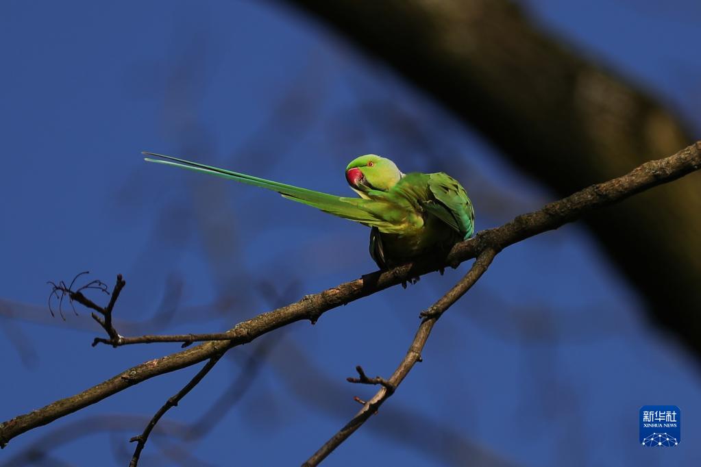 3月7日,在比利时布鲁塞尔的五十周年纪念公园,一只鹦鹉在树上栖息。