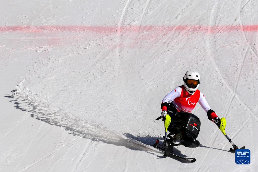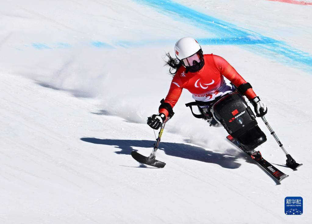 3月7日,中国选手刘思彤在北京冬残奥会高山滑雪女子全能(坐姿)比赛中,最终她获得季军。新华社记者江汉摄