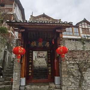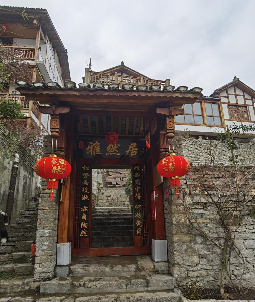 漫步到一处名叫“雅然居”的小院,房屋依山而建。沿着台阶而上,石墙、木桌边的绿植让人满目芬芳。