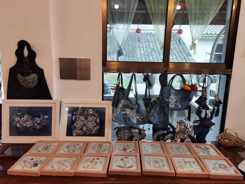 布依民俗、手工文创是陈慧珍家的特色。作为民间刺绣的非遗传承人,她几年前搬回老家偏坡,把老房子改造成非遗体验馆和农家乐,并取名“半亩篱蔬”。